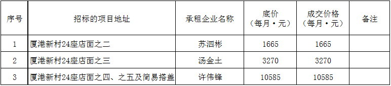 根據(jù)思明區(qū)國有企業(yè)資產(chǎn)出租管理的相關(guān)制度,我司2019年5月28日上午9:00起于觀音山營運(yùn)中心2號樓2層2號會(huì)議室進(jìn)行公開招租現(xiàn)場開標(biāo),現(xiàn)通過思明控股網(wǎng)站對外發(fā)布成交公告,內(nèi)容如下:
