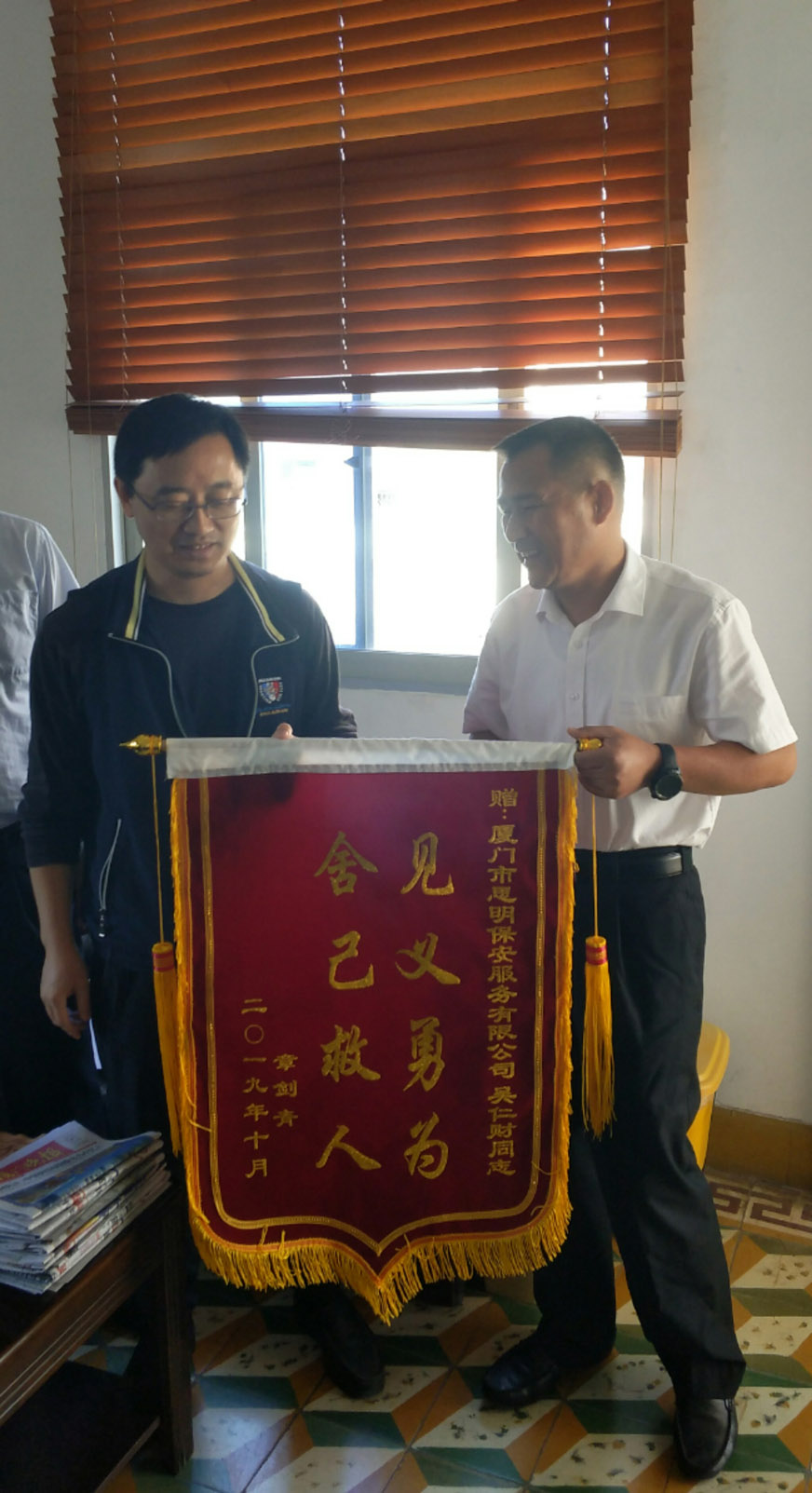 近日,市民章先生專程帶著一面印有“見義勇為,舍己救人”字樣的錦旗和一封感謝信到思明保安公司,緊握著葉總經(jīng)理的手連聲致謝,感謝保安員吳仁財(cái)同志奮不顧身救起不慎落水的老母親,同時(shí)請求保安公司要大力弘揚(yáng),學(xué)習(xí)吳仁財(cái)同志恪盡職守、不懼危險(xiǎn),奮勇救人的高尚品質(zhì),引領(lǐng)時(shí)代新風(fēng)尚,傳遞社會正能量。