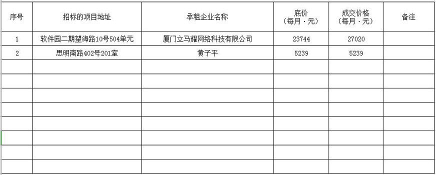 根據(jù)思明區(qū)國有企業(yè)資產(chǎn)出租管理的相關(guān)制度,我司2019年11月18日上午9:00起于觀音山營運中心2號樓2層2號會議室進(jìn)行公開招租現(xiàn)場開標(biāo),現(xiàn)通過思明控股網(wǎng)站對外發(fā)布成交公告,內(nèi)容如下:
