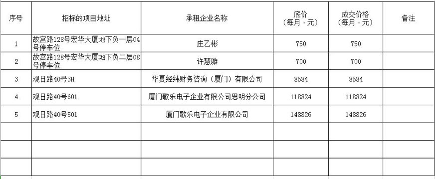 根據(jù)思明區(qū)國有企業(yè)資產出租管理的相關制度,我司2020年1月10日上午9:00起于觀音山營運中心2號樓2層2號會議室進行公開招租現(xiàn)場開標,現(xiàn)通過思明控股網(wǎng)站對外發(fā)布成交公告,內容如下: