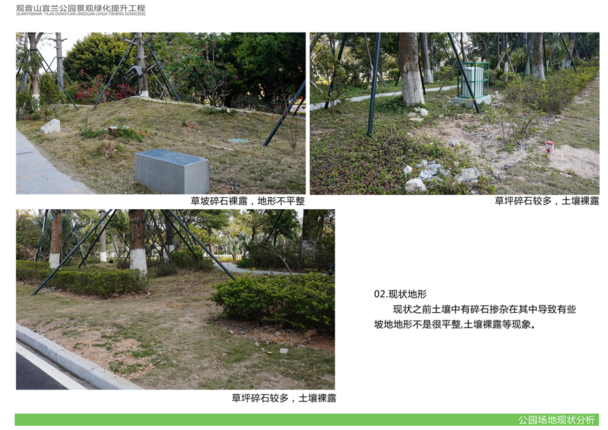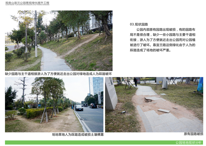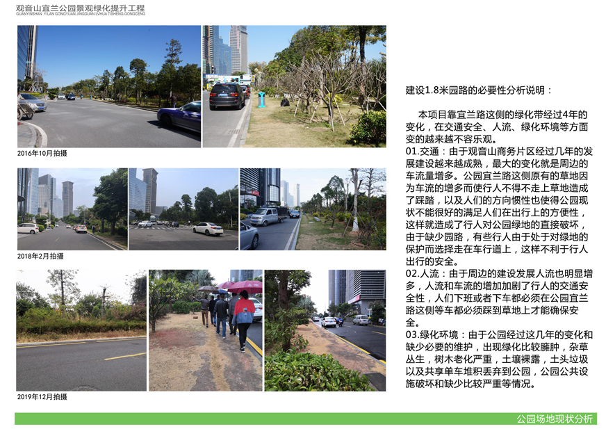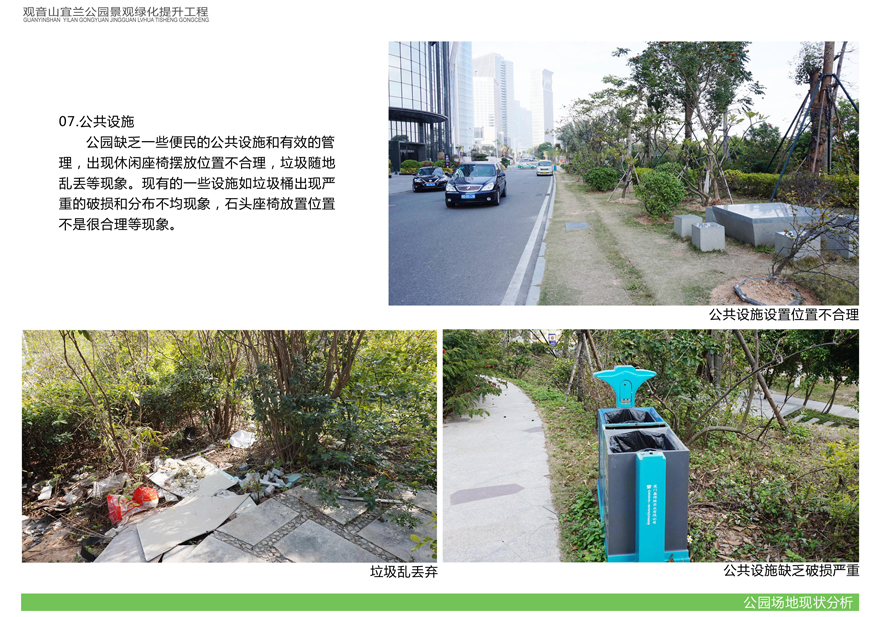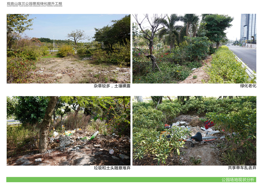 項(xiàng)目位于環(huán)島東路與觀音山商務(wù)營(yíng)運(yùn)中心之間,緊鄰城市干道環(huán)島東路及市政道路宜蘭路。該區(qū)域景觀綠化目前存在植被缺少后期養(yǎng)護(hù),雜草較多,并出現(xiàn)倒伏現(xiàn)象,影響人行交通;各類設(shè)施老化,景觀帶內(nèi)垃圾無(wú)人清除,造成環(huán)境污染;區(qū)域兩側(cè)靠近車行道,缺少必要的人行園路,安全性較差;配套設(shè)施不完善,澆灌系統(tǒng)布局不合理等問(wèn)題,嚴(yán)重影響城市形象,因此對(duì)現(xiàn)狀綠化進(jìn)行整治十分必要。