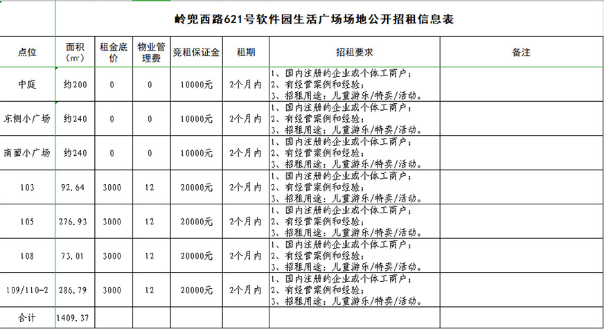 2、場地面積:詳見附表(軟件園生活廣場場地公開招租信息表)。