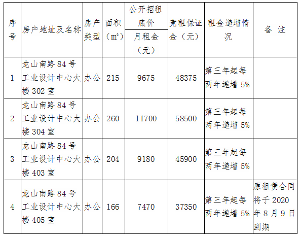 根據(jù)國有企業(yè)資產(chǎn)出租管理相關(guān)制度,我司決定對位于思明區(qū)龍山南路84號工業(yè)設(shè)計(jì)中心3至4層房產(chǎn)對符合入駐條件的意向承租人進(jìn)行公開競價招租,具體信息如下: