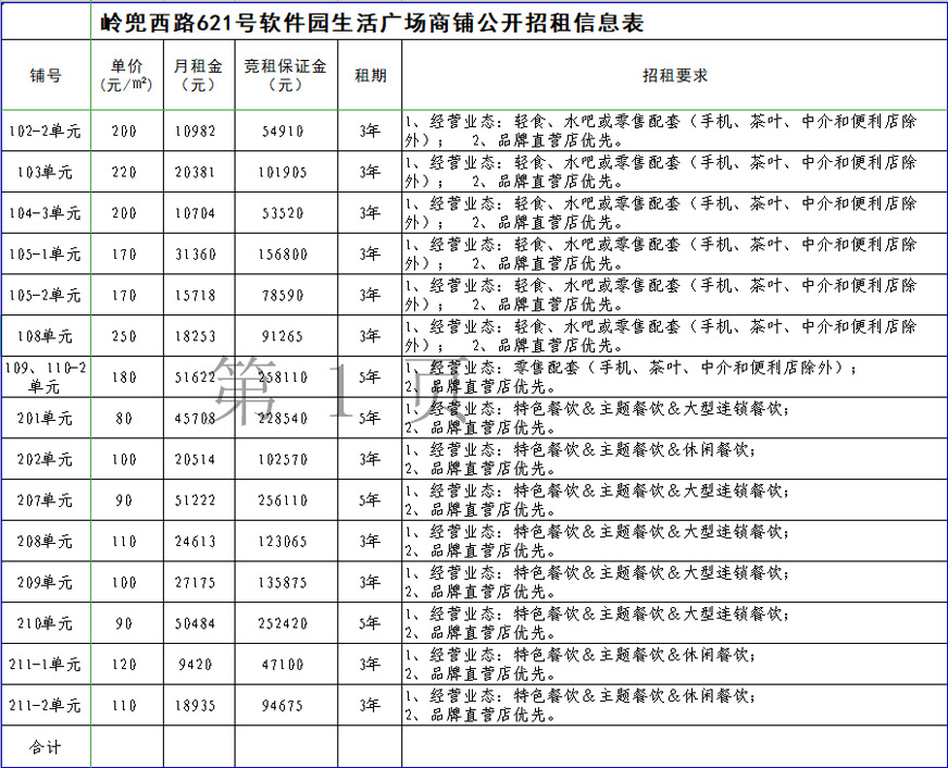 招租要求:詳見附表(軟件園生活廣場公開招租信息表)