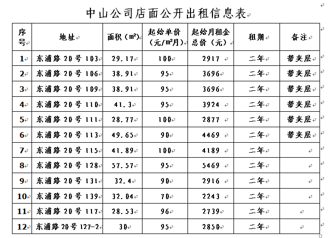 1、擬出租店面地址、建筑面積、租金底價(jià)、租賃期限等見(jiàn)下表: