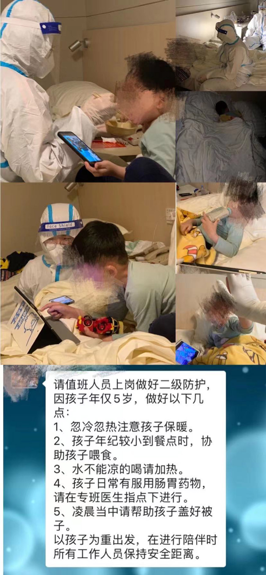 今年4月份,一名年僅5歲的小朋友獨自搭乘飛機到廈門中轉(zhuǎn),分流到隔離酒店接受隔離觀察,在沒有辦法獨自生活自理的情況下,防疫工作人員充當(dāng)起“臨時保姆”,在保證工作人員安全的前提下照顧、陪伴小朋友。