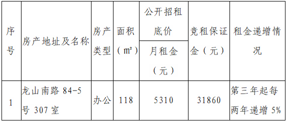 根據(jù)國有企業(yè)資產(chǎn)出租管理相關(guān)制度,我司決定對位于龍山南路84-5號307室房產(chǎn)對符合入駐條件的意向承租人進(jìn)行公開競價(jià)招租,具體信息如下: