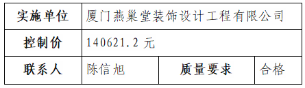 根據(jù)相關(guān)規(guī)定,我司負(fù)責(zé)裝修的園區(qū)服務(wù)大廳、驛站裝修項(xiàng)目直接發(fā)包廈門燕巢堂裝飾設(shè)計(jì)工程有限公司實(shí)施,現(xiàn)于2022年1月14日至2022年1月18日對(duì)外發(fā)布結(jié)果公告,內(nèi)容如下: