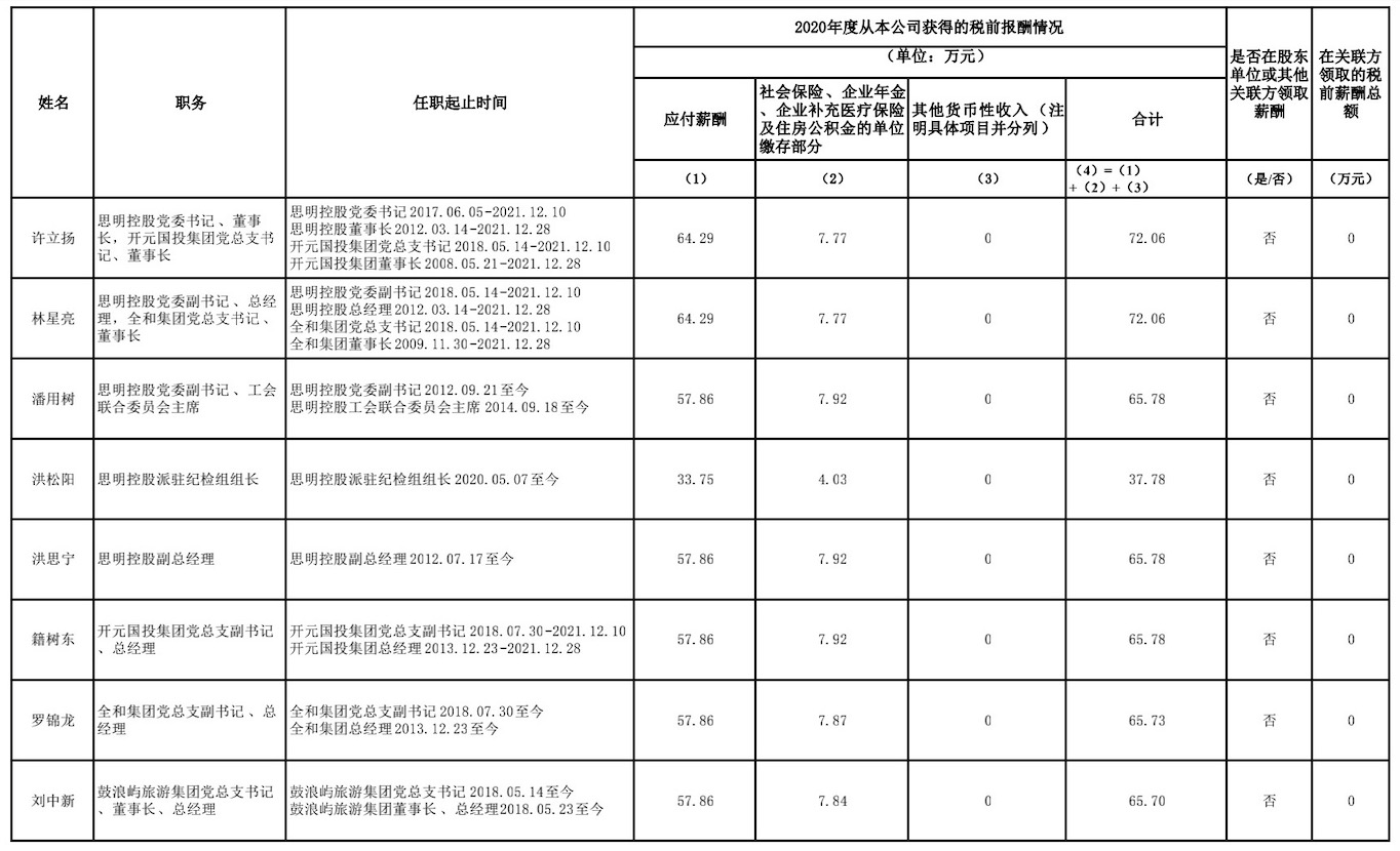 1.上表披露薪酬為廈門思明國有控股集團(tuán)有限公司及三家二級公司企業(yè)負(fù)責(zé)人2020年度全部應(yīng)發(fā)稅前薪酬,不含三年任期激勵(lì)。