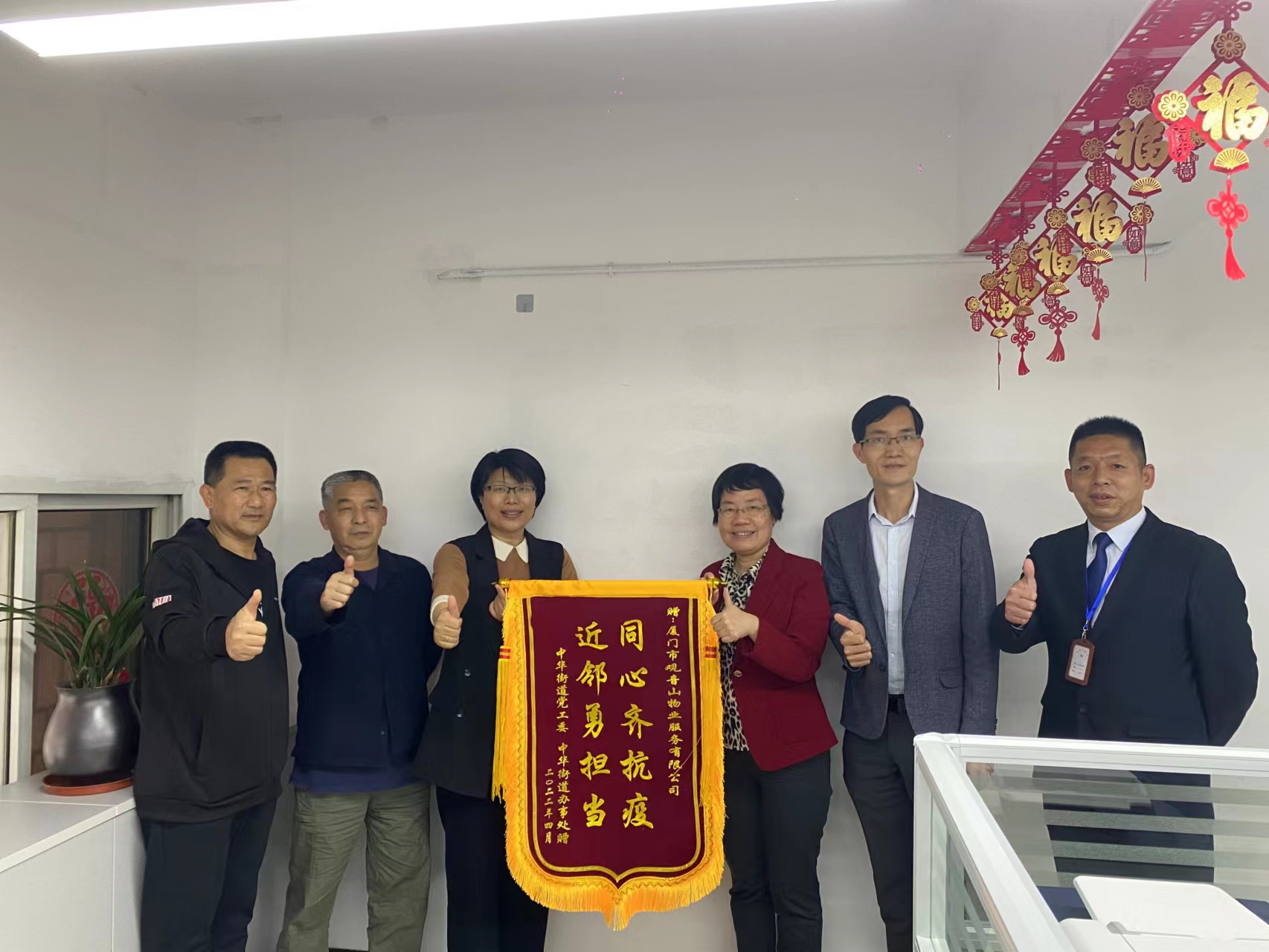 4月20日下午,中華街道黨工委副書記、街道辦主任王雪梅率街道四級調(diào)研員嚴(yán)開松、黨政辦負(fù)責(zé)人蘇江圳一行給思明控股觀音山物業(yè)所屬中山路服務(wù)中心送上錦旗和慰問信,感謝思明控股集團觀音山物業(yè)中山路服務(wù)中心團隊全力配合協(xié)助街道疫情防控工作,對團隊致以崇高的敬意和衷心的感謝。