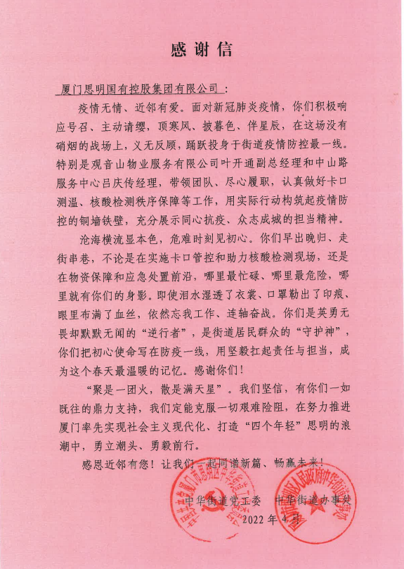 正如中華街道感謝信中所說“聚是一團火,散是滿天星”!觀音山物業(yè)團隊始終用堅毅扛起責(zé)任與擔(dān)當(dāng),義無反顧,勇毅前行,努力做街道居民群眾的“守護者”,做美麗廈門幸福思明的“踐行者”。