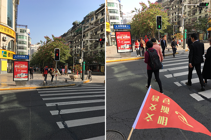 志愿者穿起紅色馬甲,佩帶紅帽子、口哨,手拿督導(dǎo)指示旗為城市文明助力