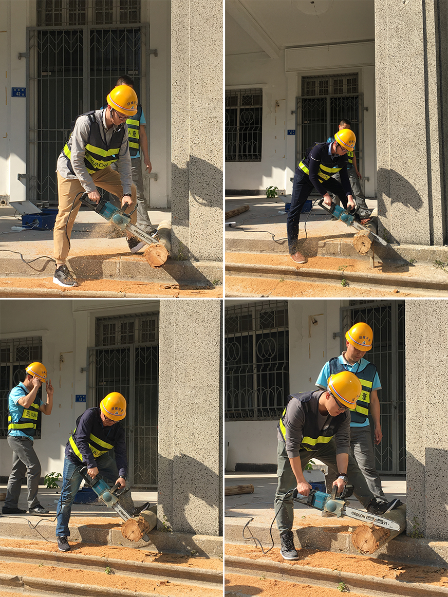在應(yīng)急搶險器材中電鋸的操作演練環(huán)節(jié),隊員們整齊有序,一個接一個,沒有過關(guān)主動再操作一次,一轉(zhuǎn)眼功夫,一塊大長條的原木被隊員們像切白蘿卜般輕輕松松一塊塊分身落地,場地響起雷鳴般的掌聲。