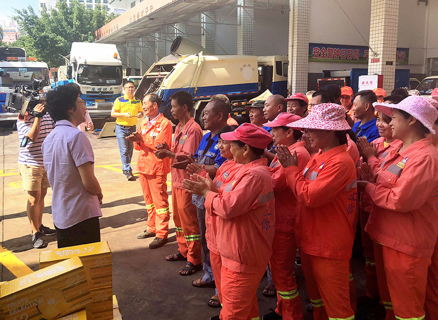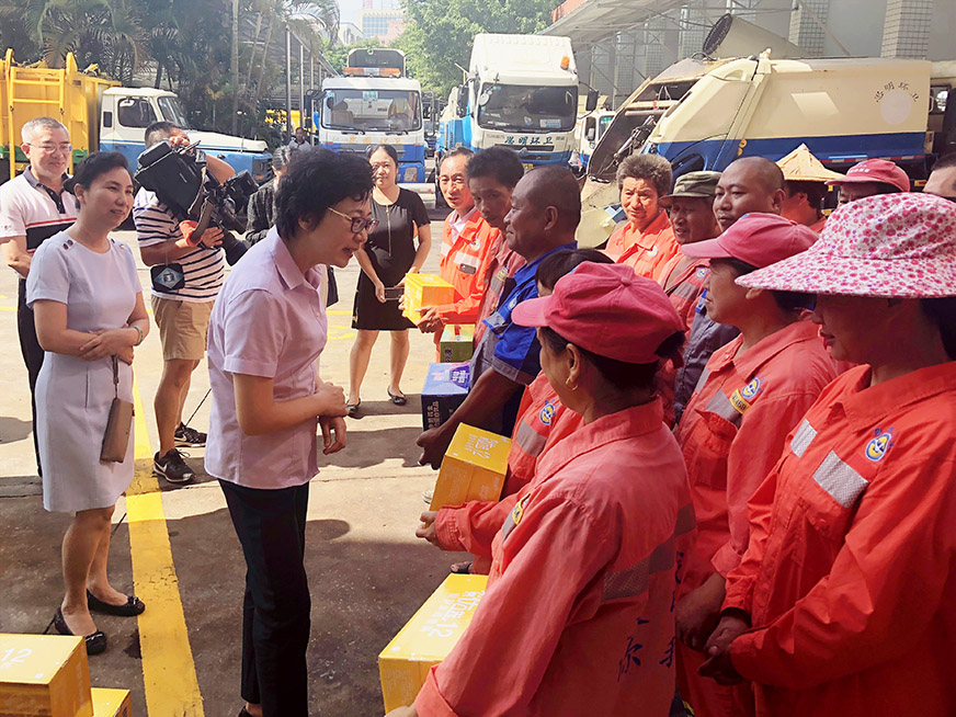 7月4日上午,廈門市委常委、市總工會主席倪超一行到思環(huán)公司洪文車場慰問環(huán)衛(wèi)工人,為戰(zhàn)酷暑的工人送去防暑降溫藥品、飲料,送去深情問候。
