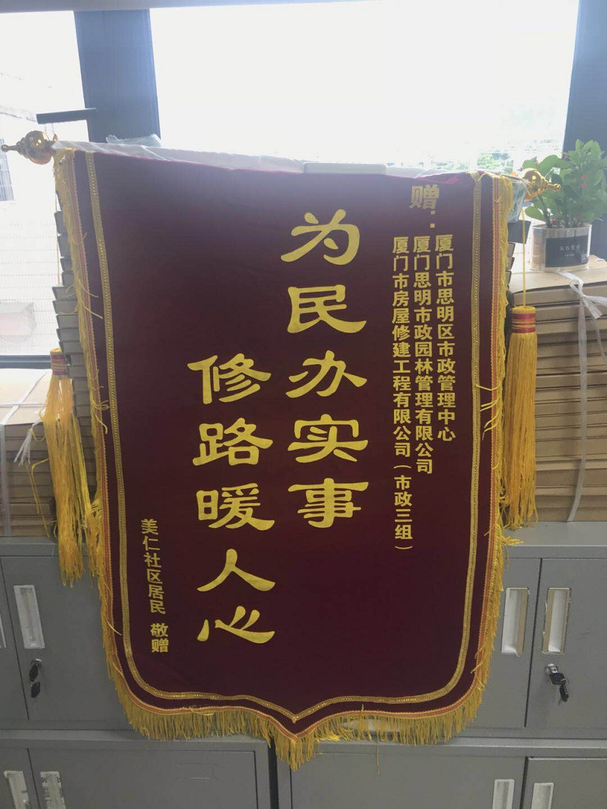 日前,思明市政園林管理有限公司收到了美仁社區(qū)居民送來的一面寫有“為民辦實事 修路暖人心”的錦旗,對公司在美仁社區(qū)進(jìn)行的老舊小區(qū)市政設(shè)施管養(yǎng)和提升工作表示了衷心的感謝。