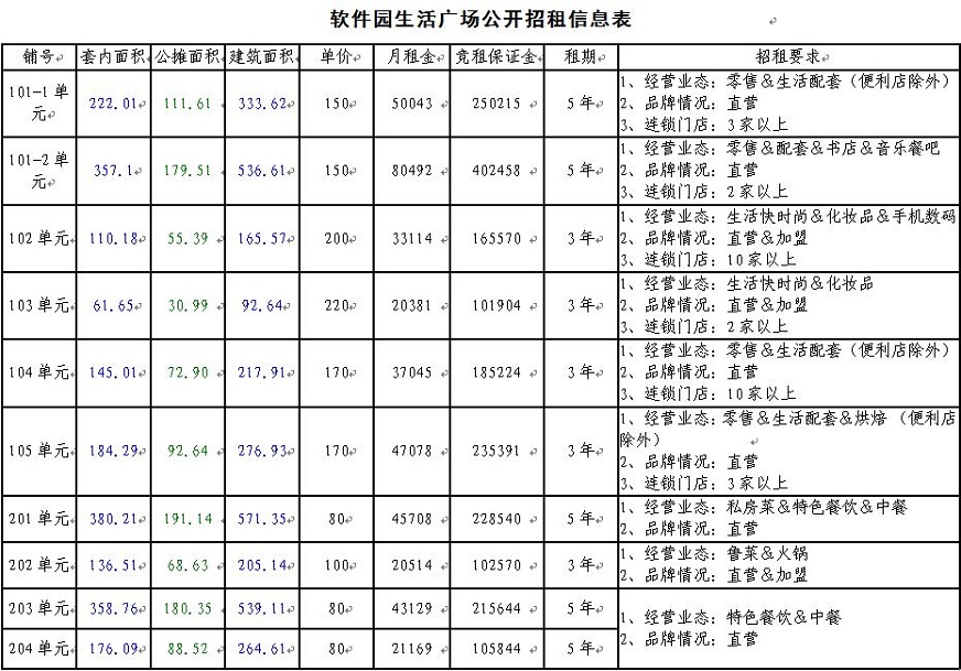 3、用途:商業(yè)(業(yè)態(tài)) ,招租要求:詳見附表(軟件園生活廣場公開招租信息表)