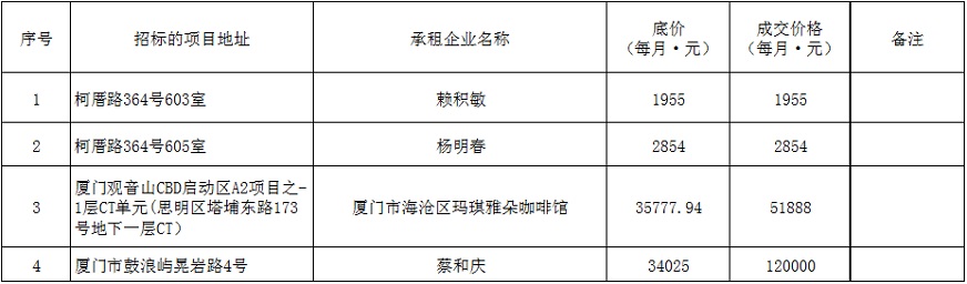 根據(jù)思明區(qū)國有企業(yè)資產(chǎn)出租管理的相關(guān)制度,我司2019年4月1日上午9:00起于觀音山營運中心2號樓2層2號會議室進行公開招租現(xiàn)場開標(biāo),現(xiàn)通過思明控股網(wǎng)站對外發(fā)布成交公告,內(nèi)容如下: