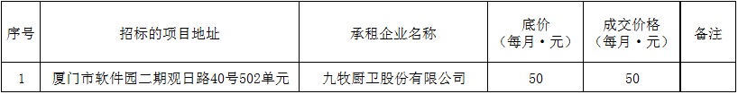 根據(jù)思明區(qū)國(guó)有企業(yè)資產(chǎn)出租管理的相關(guān)制度,我司2019年4月11日上午9:00于觀音山營(yíng)運(yùn)中心2號(hào)樓2層2號(hào)會(huì)議室進(jìn)行公開招租現(xiàn)場(chǎng)開標(biāo),現(xiàn)通過思明控股網(wǎng)站對(duì)外發(fā)布成交公告。內(nèi)容如下: